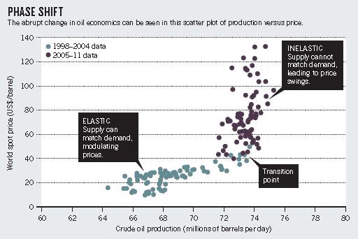 Hace ya algunos años, David King y James Murray publicaron un artículo en Nature en el cual analizaron, entre otras cosas, cuál era la elasticidad de la producción del petróleo, es decir, la capacidad de la producción de petróleo de responder a los incrementos de demanda.