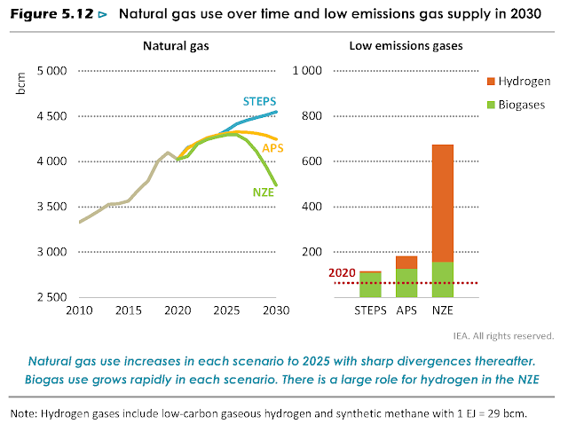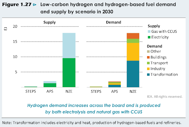 Demostrando el grado de desesperación al que estamos llegando, este WEO da un grado de protagonismo al hidrógeno que no había tenido en los WEOs anteriores. No volveremos a incidir en la absurdidad termodinámica del hidrógeno y el riesgo de que su explotación lleve a una depauperación colonial de la mayoría del mundo excepto una pequeña metrópoli. Aun y todo, incluso en el escenario más extremo, NZE, se asume que la producción y consumo de hidrógeno en 2030 serán bastante modestos, menos de 20 EJ (en frente de los 570 EJ de consumo total de energía primaria en el mundo actualmente). Pero lo más curioso es que cerca de la mitad de ese hidrógeno se produciría a través de gas natural con captura, secuestro y utilización de carbono, otro absurdo termodinámico.