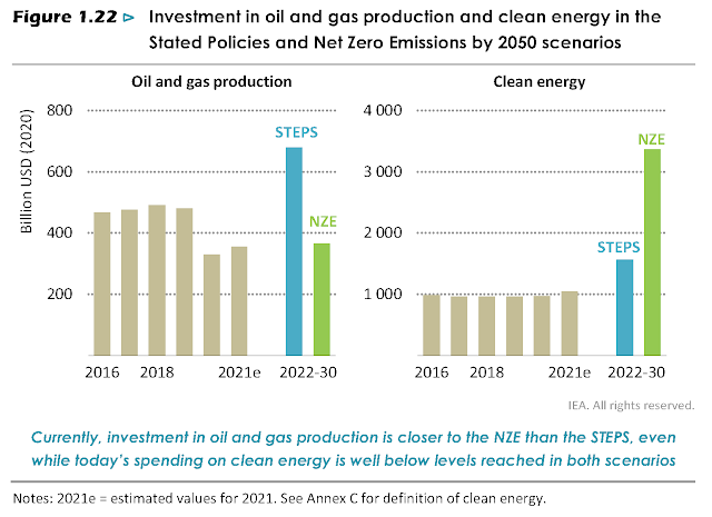 Resulta muy ilustrativa la gráfica que nos muestra el WEO sobre la evolución reciente de la inversión en exploración y desarrollo de petróleo y gas, por un lado, y en sistemas «de energía limpia» por el otro lado. Sobre todo porque esa gráfica muestra una clara intención de engañar y confundir, que desde mi punto de vista es casi delictiva.