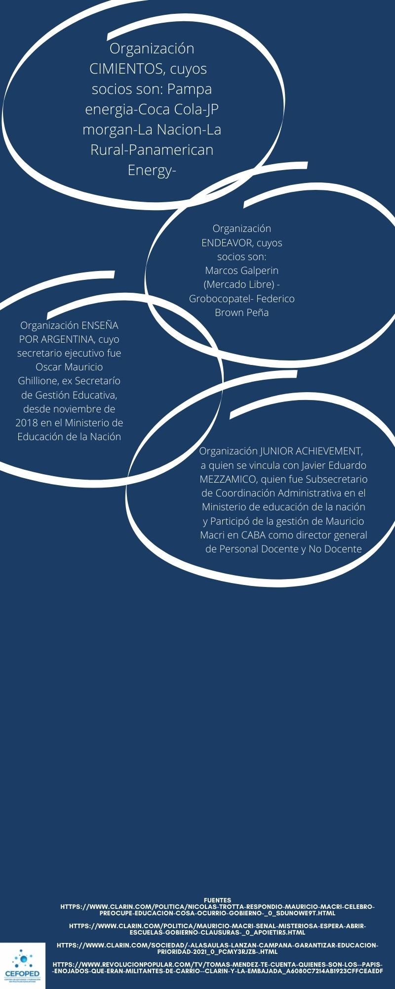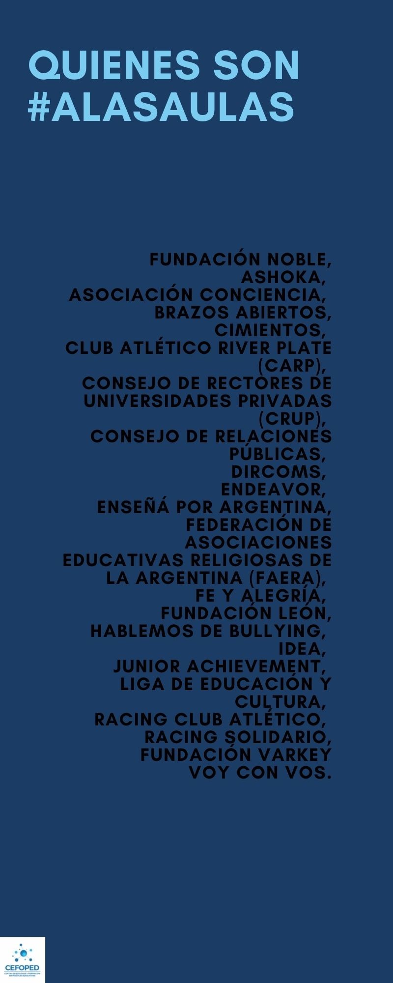 Las instituciones de consulta y diseño de programas y planes educativos, del bloque JxC, son ONG’s y organizaciones especializadas en el área educativa, quienes se posicionaron ante este conflicto cuando el 19 de diciembre publicaron el lanzamiento de la plataforma digital #ALasAulas, compuesto por ejemplo, por fundaciones como Fundación Noble, Fundación Varkey, Junior Achievement, Enseñá por Argentina, Asociación Conciencia, entre otras.