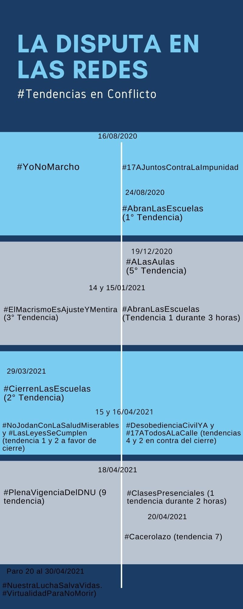 En este vaivén judicial, las alianzas Juntos por el Cambio y Frente de Todxs se movilizaron. Por un lado, dentro del bloque de JxC el colectivo «Padres Organizados» convocó a un cacerolazo por las redes sociales en diferentes barrios de la CABA a favor de la presencialidad escolar. Mientras que, en el bloque FdeT, los gremios porteños convocaron a un paro por tiempo indeterminado, y lograron que la presencialidad en las escuelas de la Ciudad no llegara al 10%. La Unión de Trabajadores de la Educación (UTE) y la Asociación Docente de Enseñanza Media y Superior (Ademys) informaron que hubo un 90% de acatamiento de la medida; y en el sector privado se realizó retención de tareas presenciales hasta el 30 de abril, con un 70% de alcance, según el gremio SADOP (quienes representan un 50% del total del personal docente de CABA) (2).
