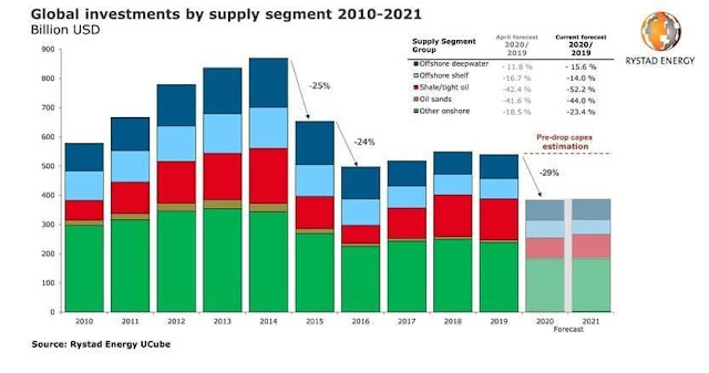Desde 2018, toda esa distinción queda borrada y la AIE nos informa de cuánto petróleo se va a producir según se invierta más o menos. Eso, al tiempo que nos reconoce (por ejemplo, en el informe de 2018) que se observa una caída en la inversión, o en el informe de este año, donde avisa que podría haber problemas de suministro («problemas de seguridad energética», le dicen) debido a la falta de inversión. Está claro, por tanto, que ahora lo que se considera más importante es aclarar cuál va ser el escenario de inversión para los próximos años, sobre todo cuando en este momento nos movemos entre el peor escenario y el segundo peor, como muestra esta gráfica de Rystad Energy: