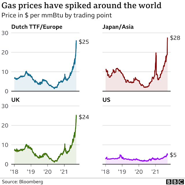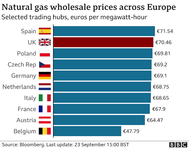 Si uno mira la evolución del precio del gas en los diversos países de Europa, se ve que en cuestión de un año se ha multiplicado por 5 o más (en el caso de España, hace un año valía 11€/MW·h; actualmente casi 7 veces más, 71,5 €/MW·h). Incluso comparado con los precios de antes de la pandemia, típicamente se ha multiplicado por 3.