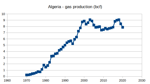 Argelia, por supuesto, no es Rusia, y eso hace que Europa -y particularmente su antigua metrópoli, Francia- se ingieran de manera más directa en los asuntos internos argelinos. Por ese motivo se hablaba hace casi una década de intentar explotar el gas de shale en la zona sur de Argelia, aunque esos proyectos nunca han llegado a cuajar (seguramente por el escaso rendimiento y las grandes necesidades de agua que requiere ese tipo de explotación). Todo indica que Argelia también ha pasado su peak gas, pero no es solo eso.
