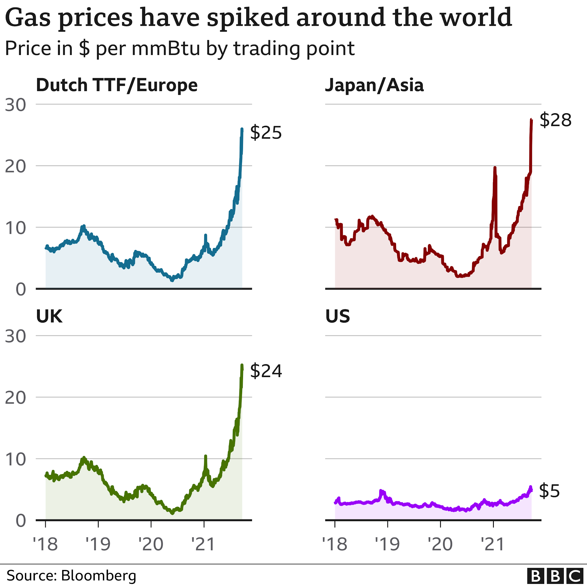 Si uno mira la evolución del precio del gas en los diversos países de Europa, se ve que en cuestión de un año se ha multiplicado por 5 o más (en el caso de España, hace un año valía 11€/MW·h; actualmente casi 7 veces más, 71,5 €/MW·h). Incluso comparado con los precios de antes de la pandemia, típicamente se ha multiplicado por 3.
