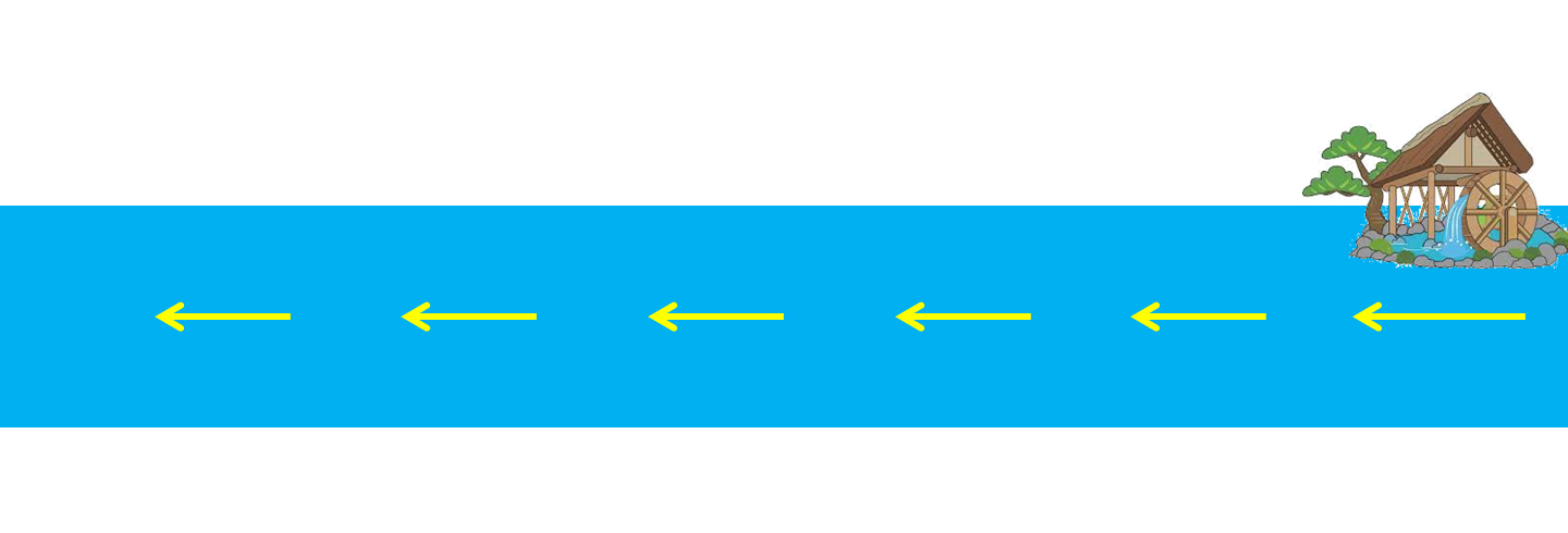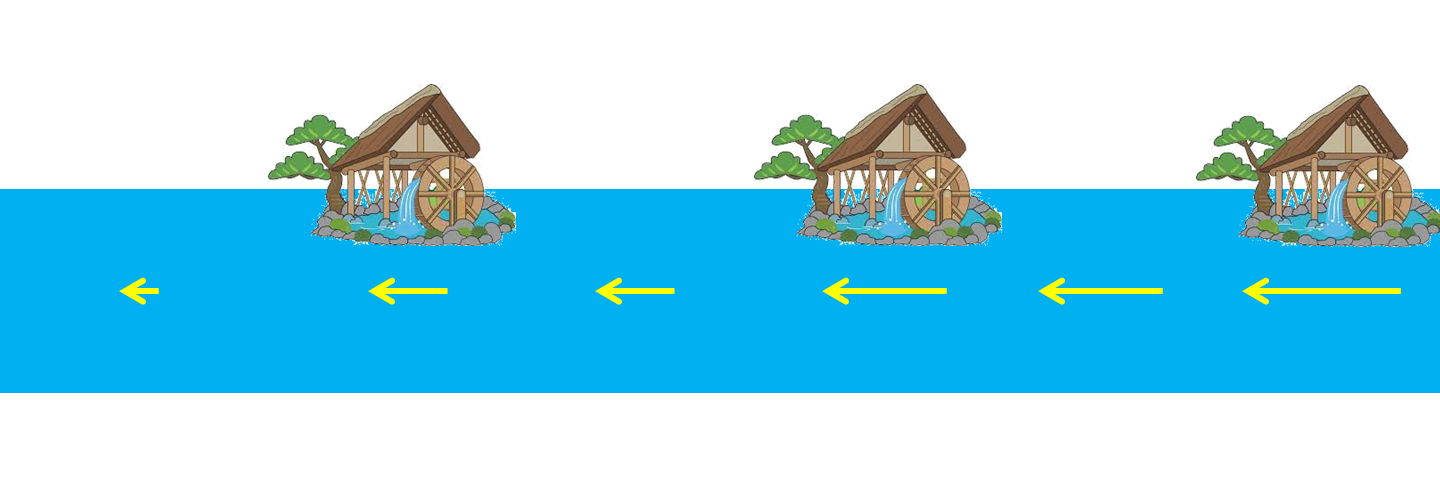 Queremos aprovechar la fuerza del río y medimos la velocidad del agua en este tramo: en todos los sitios nos sale que el agua avanza a 10 kilómetros por hora. Por tanto, si ponemos muchos molinos en este curso de agua podremos generar mucha energía, ya que en cada punto tendremos un curso del agua con esa velocidad. Por tanto vamos e instalamos el primer molino en el curso alto. Es un molino muy grande, que aprovecha una parte muy grande de la energía de nuestro curso de agua. Una vez en marcha, vemos que, efectivamente, nuestro molino nos produce toda la energía que teníamos previsto. Sin embargo, pasa algo que no nos esperábamos.