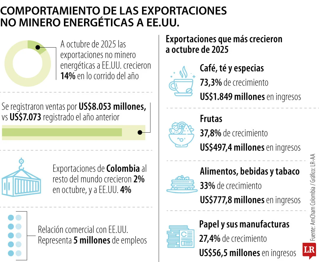 Este sector se estaría posicionando como el jalonador de la relación comercial entre Colombia y Estados Unidos, registrando ventas de US$8.053 millones vs US$7.073 registrados en los mismos meses de 2024, según datos del Dane.