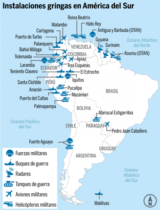 La meta, apoderarse de los recursos naturales y el control geoestratégico de la región. De las 76 bases, están 12 en Panamá, 12 en Puerto Rico, 9 en Colombia, 8 en Perú, 3 en Honduras y 2 en Paraguay,